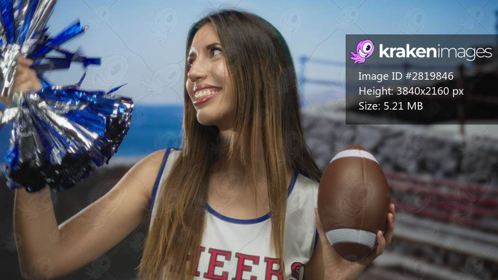 Woman smiling and holding football and pompom on street under sunlight; team spirit cheer excitement.