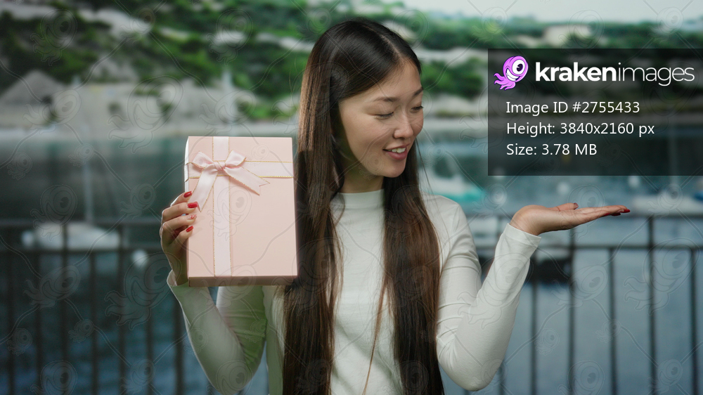 Woman smiling holding gift box with pink ribbon near seaside with boats in the background during daytime suggesting joy and celebration outdoors.