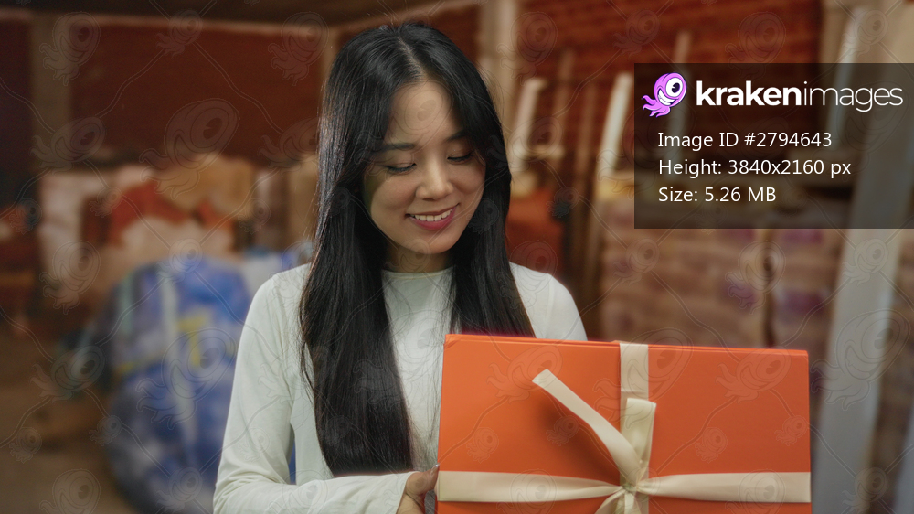 Woman smiling holding gift indoors at construction site with brick wall background, showcasing a cheerful moment amid industrial setting.