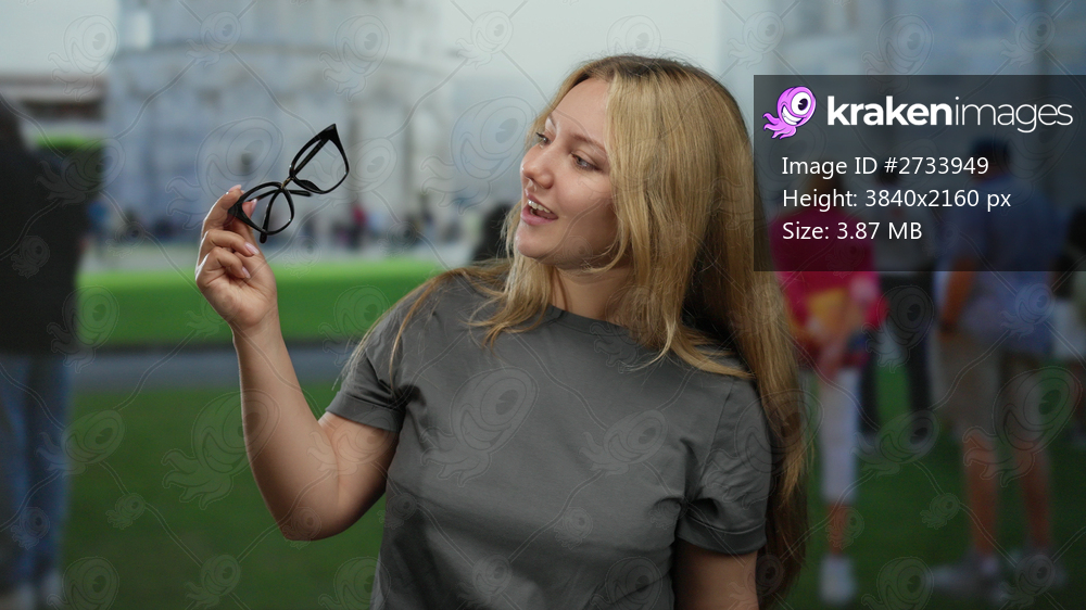 Woman smiling holding glasses in front of pisa tower outdoors with tourists in the background on a clear day in italy showcasing a casual travel moment. - Kraken Images