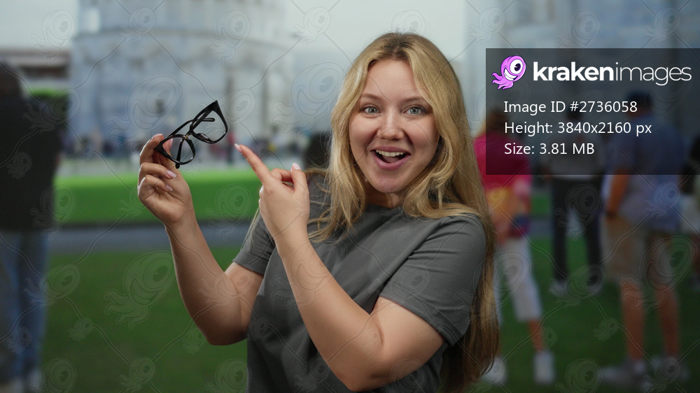 Woman smiling holding glasses in front of pisa tower outdoors with tourists in the background on a clear day in italy showcasing a casual travel moment. - Kraken Images