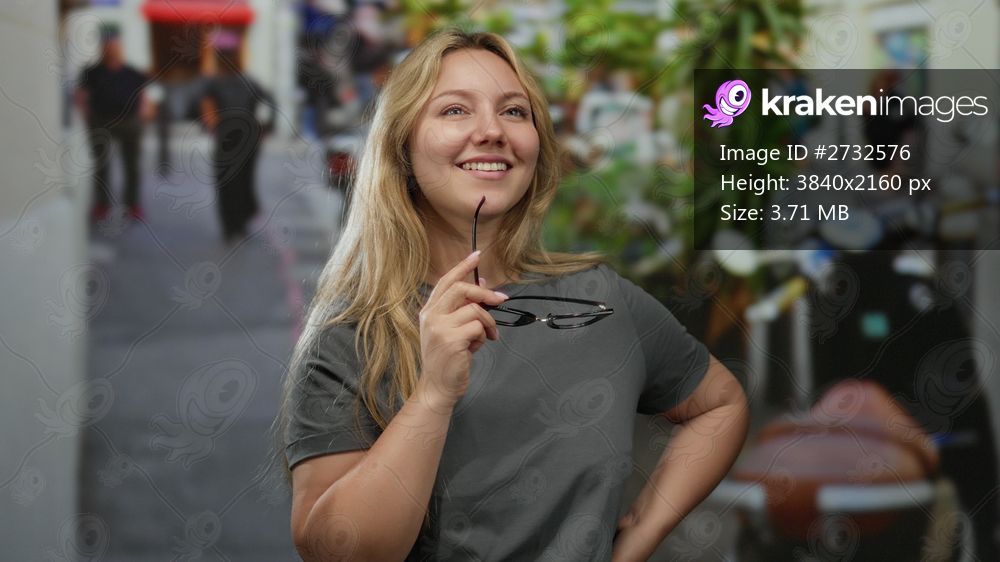 Woman smiling holding glasses on city street with plants and blurry people in background showcasing urban setting with casual style and outdoor environment. - Kraken Images
