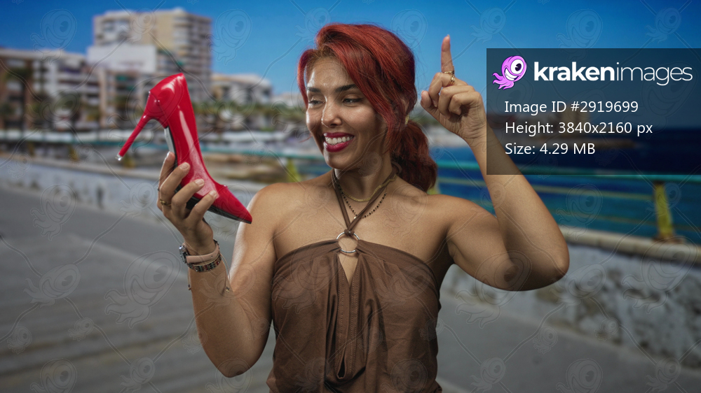 Woman smiling and holding glossy red high heel in hand while pointing finger up on promenade with buildings in view; playful confidence.