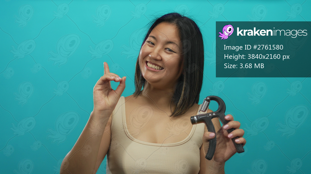 Woman smiling holding hand gripper against vibrant green background, showcasing fitness and strength in a cheerful manner.