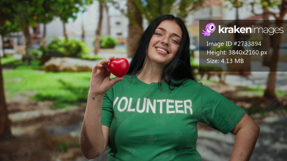 Woman smiling holding heart symbol in park wearing green volunteer shirt, showcasing community spirit, plus size, curvy woman, against vibrant outdoor background. - Kraken Images
