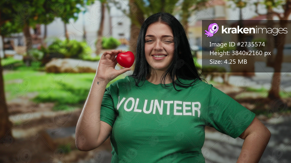Woman smiling holding heart symbol in park wearing green volunteer shirt, showcasing community spirit, plus size, curvy woman, against vibrant outdoor background. - Kraken Images