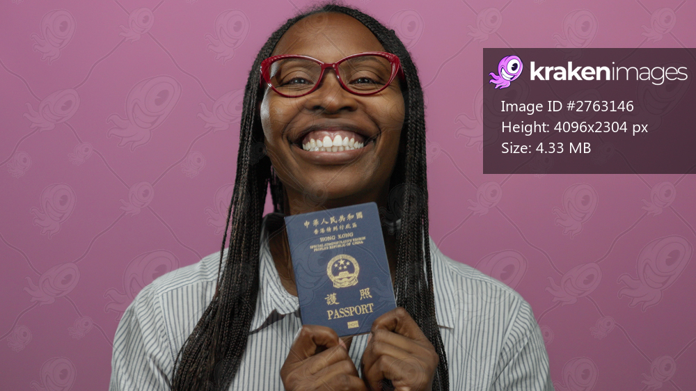 Woman smiling holding hong kong passport against pink background displaying adult identity travel concept.