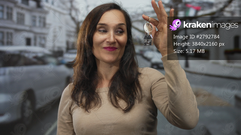 Woman smiling and holding house-shaped keychain outdoors on urban street, capturing joyful real estate concept with blurred car and buildings in background. - Kraken Images