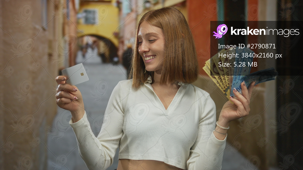 Woman smiling holding hungarian forint banknotes and credit card outdoors in an old town street setting showcasing financial freedom and travel.
