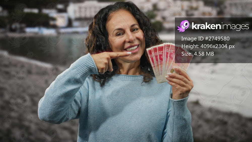 Woman smiling holding israeli shekels while gesturing okay on a seaside beach with blurred water background outdoors.