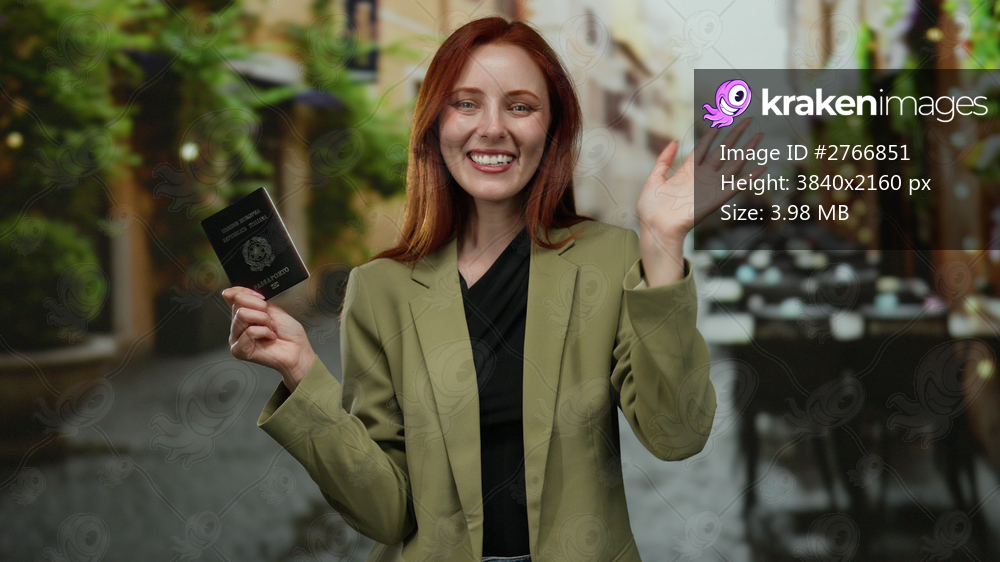 Woman smiling holding italian passport on terrace of outdoor restaurant in city street, embodying travel and identity theme with a vibrant urban backdrop. - Kraken Images