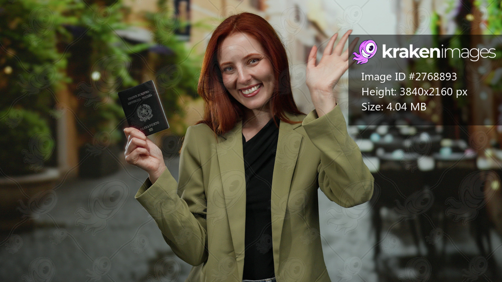Woman smiling holding italian passport on terrace of outdoor restaurant in city street, embodying travel and identity theme with a vibrant urban backdrop. - Kraken Images
