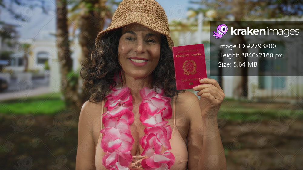 Woman smiling holding italian passport wearing bikini and pink lei in sunny park