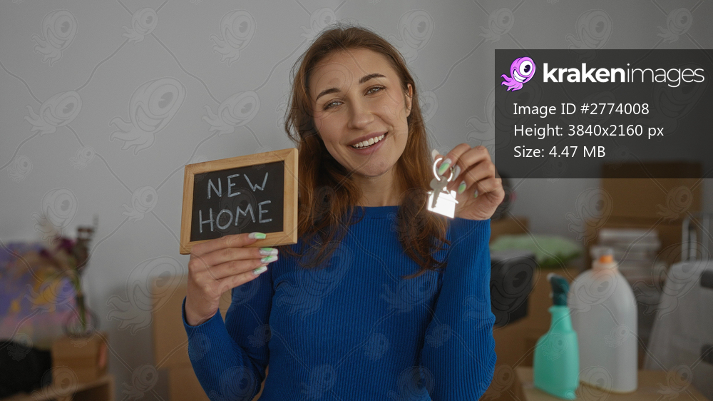 Woman smiling holding keys and new home sign in cozy living room indicates exciting move and fresh beginning in modern apartment setting.