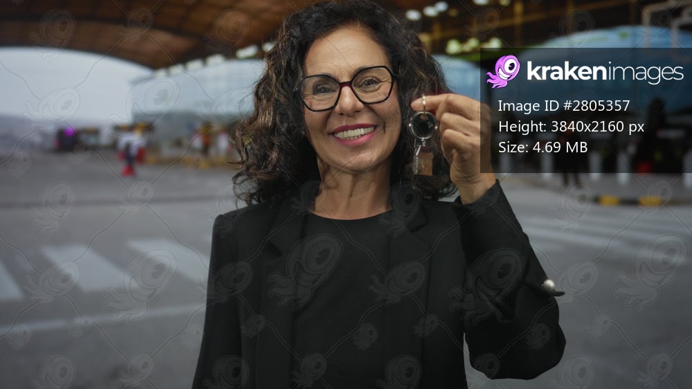 Woman smiling holding keys outdoors near an airport terminal showcasing travel and arrival context in a vibrant scene featuring happy expression and transportation theme. - Kraken Images
