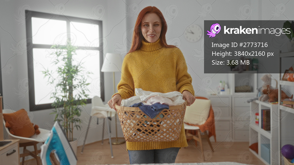 Woman smiling holding laundry basket in cozy home room with bright window and decor, showcasing domestic cleaning routine.