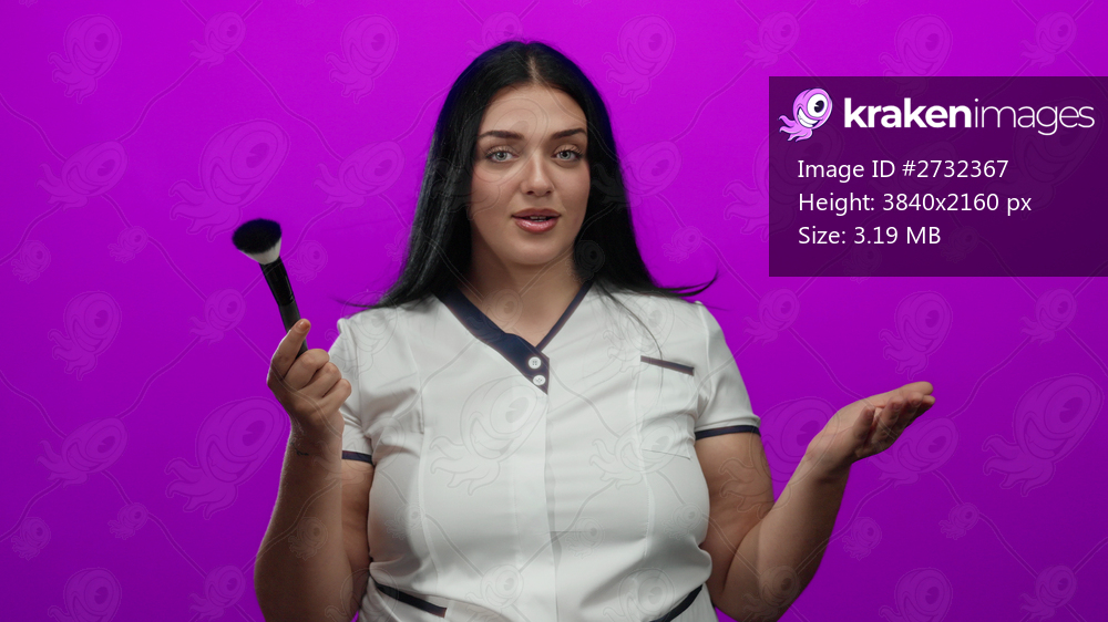 Woman smiling and holding makeup brush in front of vibrant pink background, showcasing beauty and confidence.
