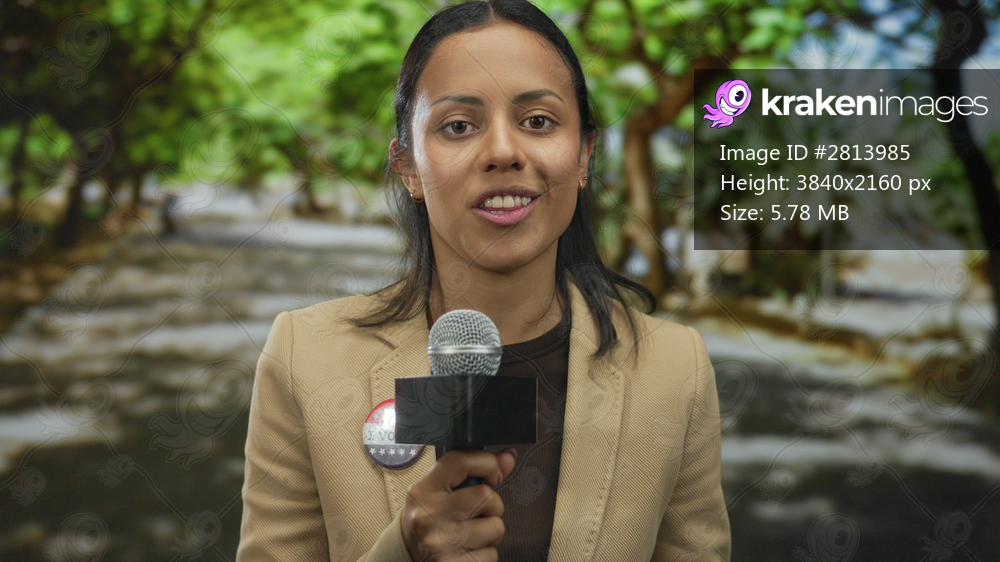 Woman smiling holding microphone with i voted badge in outdoor park setting, showcasing civic engagement and journalism in the united states.