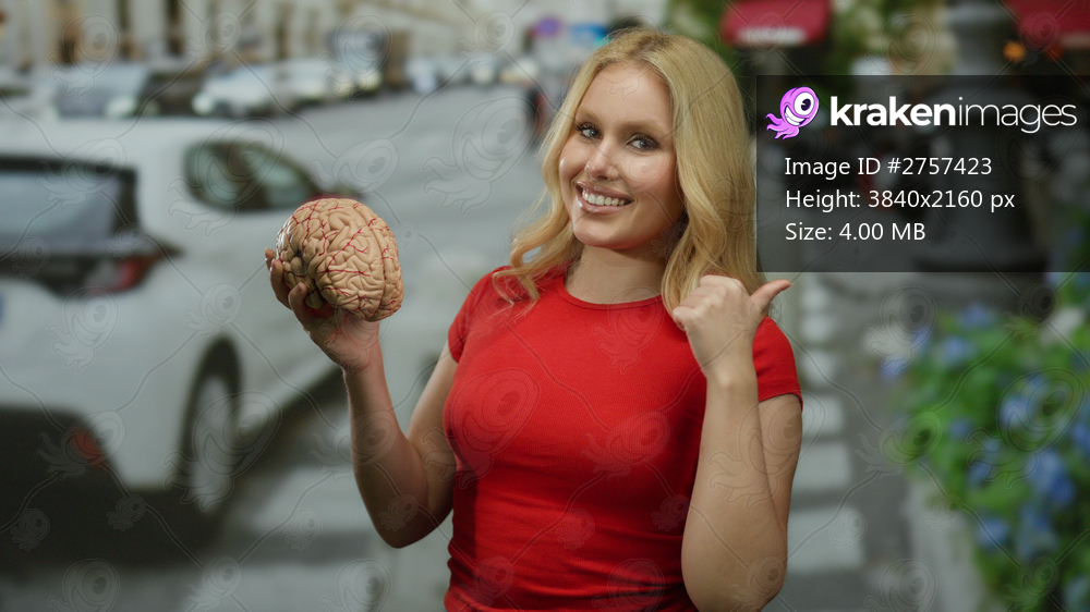 Woman smiling holding model brain in street city background vibrant environment showcasing intelligence concept