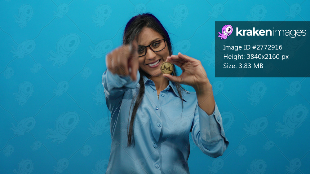 Woman smiling holding monero coin pointing at camera against an isolated blue background representing cryptocurrency and digital money concepts.