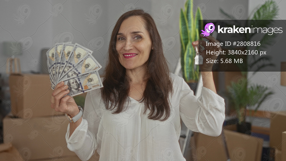 Woman smiling holding money and house keys indoors in new home surrounded by boxes, celebrating success and new beginnings.