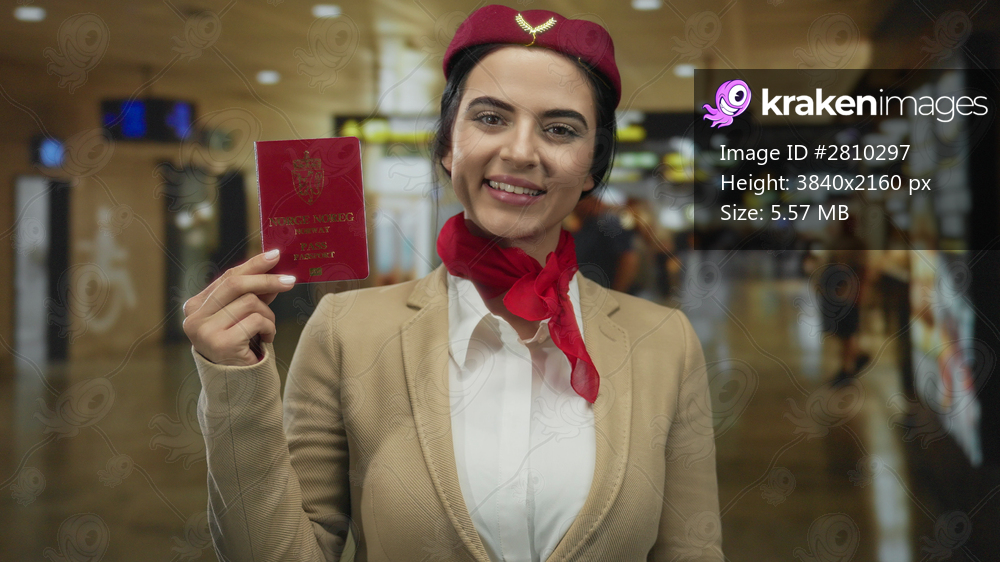 Woman smiling holding norwegian passport in airport showcasing flight identity against bustling indoor background.