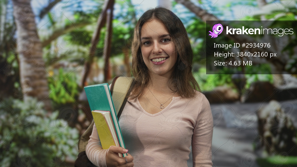 Woman smiling, holding notebooks and backpack strap, hand gripping books at chest and wearing heart pendant while standing on a forest path among green trees; confidence study ambition. - Kraken Images
