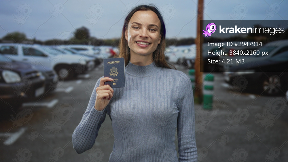 Woman smiling and holding passport up on a street with parked cars in a parking lot near a pole and wet asphalt; travel pride.