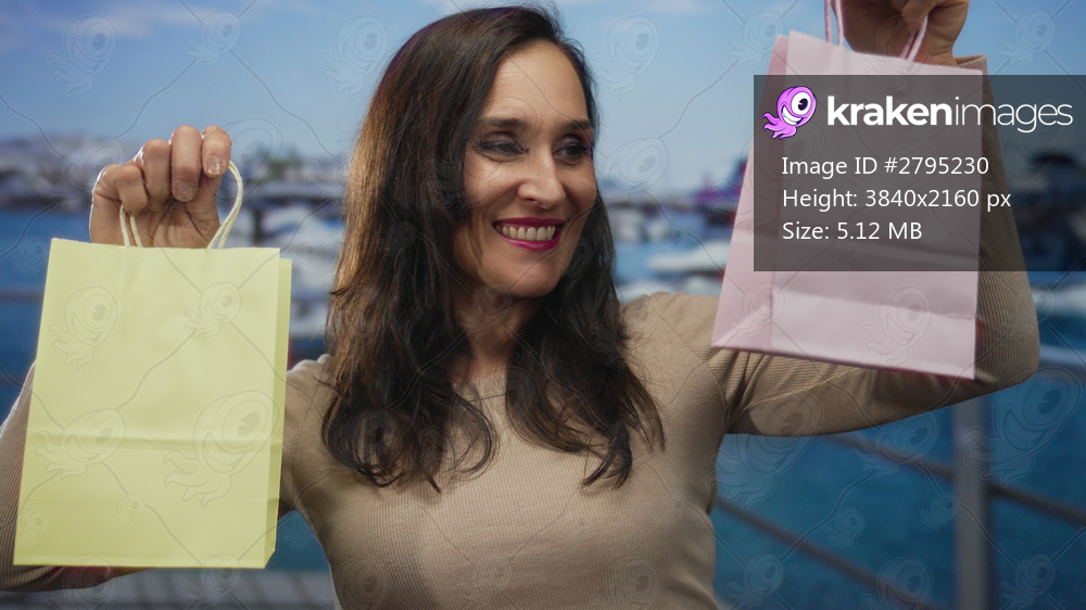 Woman smiling holding pastel shopping bags at seaside port with boats in the background on a sunny day.