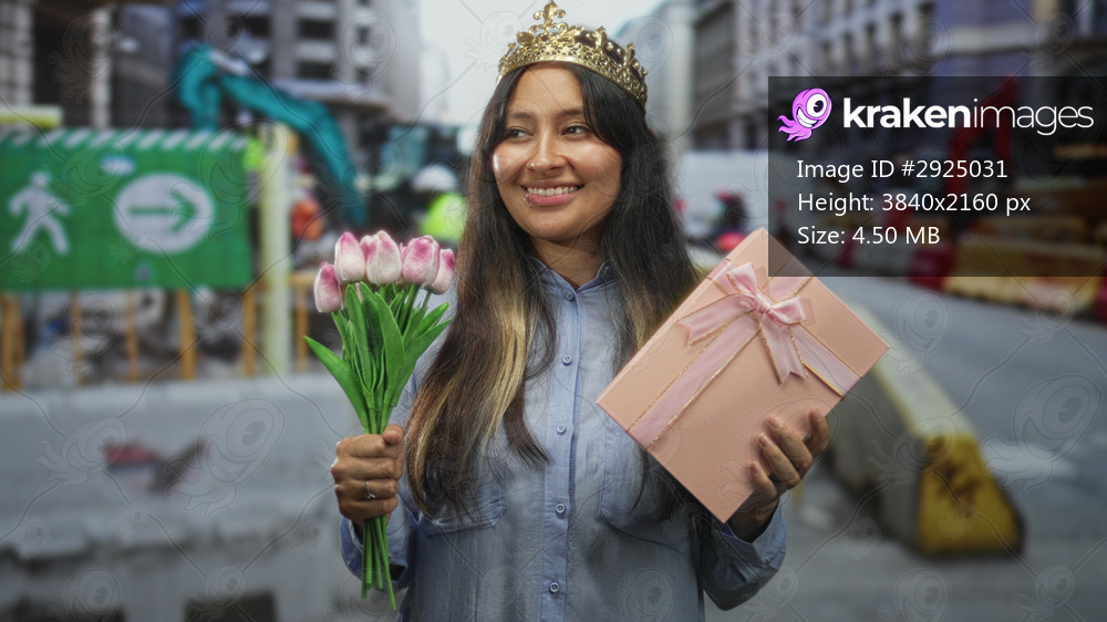 Woman smiling and holding pink gift box and tulip bouquet on street construction site wearing a crown and casual shirt; joy celebration.