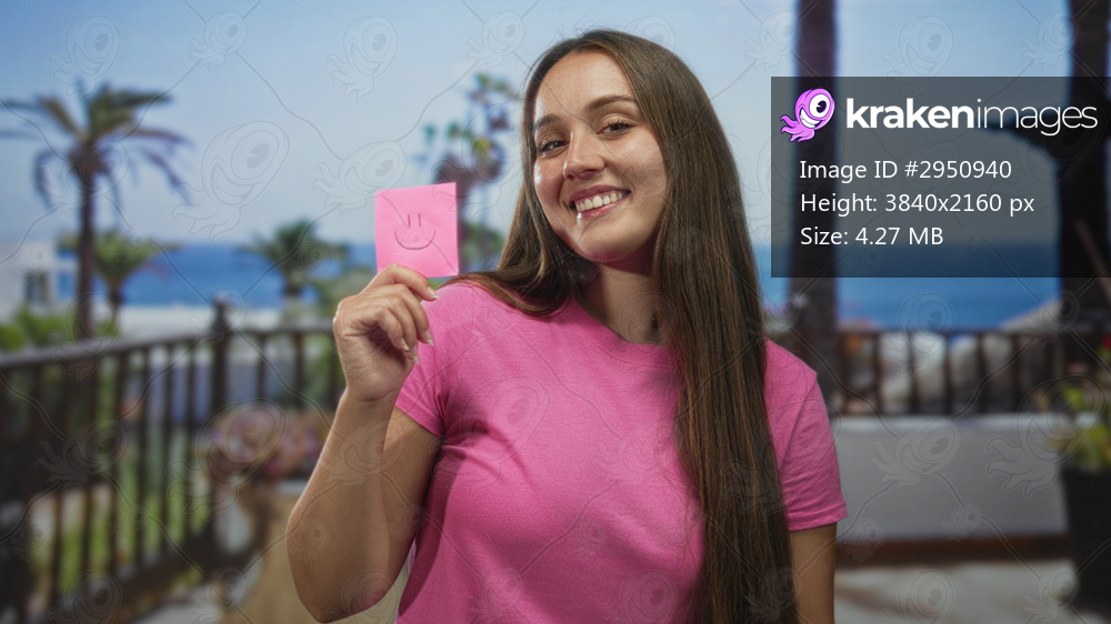 Woman smiling and holding pink note with smiley face on building balcony overlooking ocean and palm trees; happiness friendly message.
