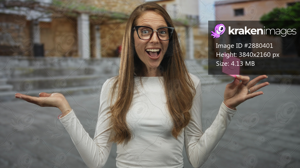 Woman smiling holding pink sticky note with open palm and glasses on cobblestone street near stone steps; cheerful optimism.