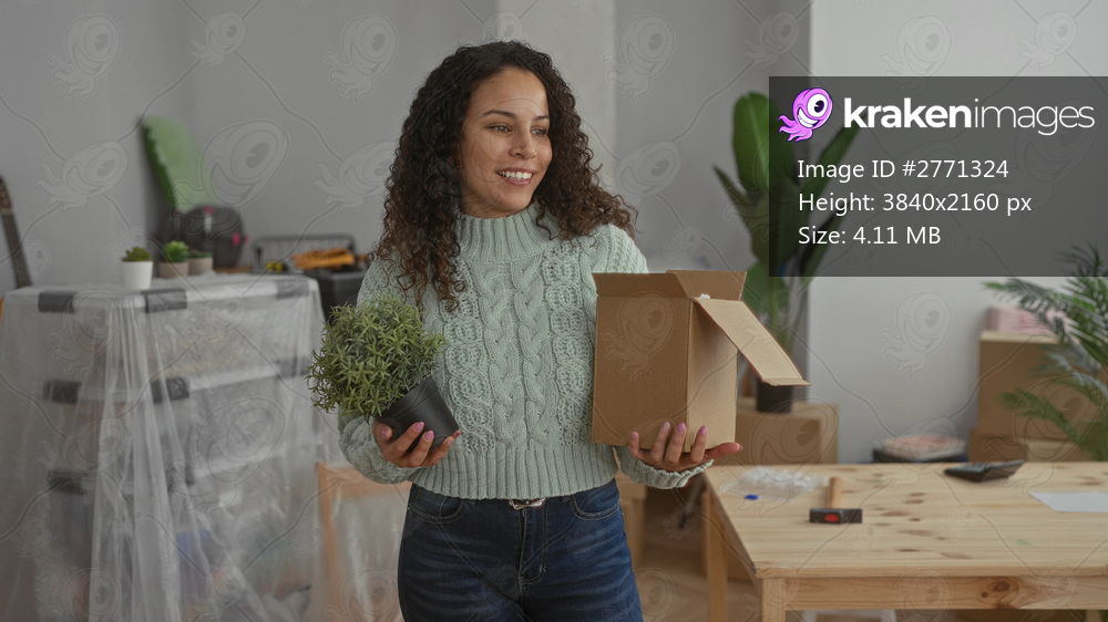 Woman smiling holding plant and box in new home living room with unpacked items and furniture covered.