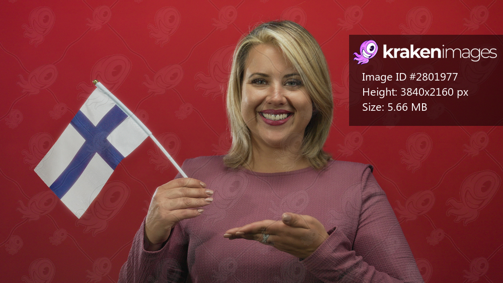 Woman smiling holding and pointing finger to finland flag against red studio backdrop; national pride.
