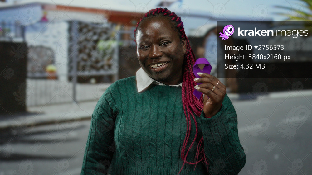Woman smiling holding purple ribbon on city street, showcasing awareness in urban outdoor setting during daytime.
