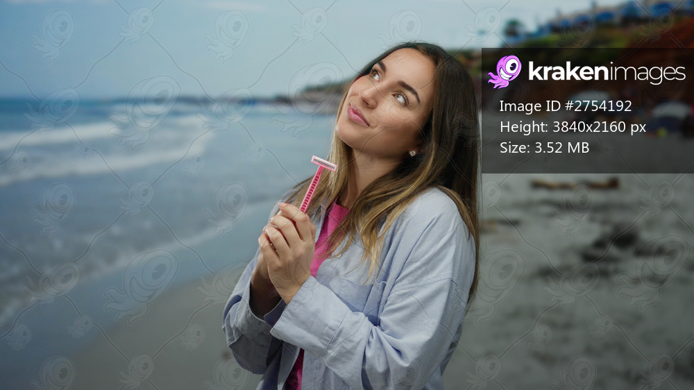Woman smiling holding razor at beachside on a sunny day showcasing joyful outdoor activity with vibrant seaside background.