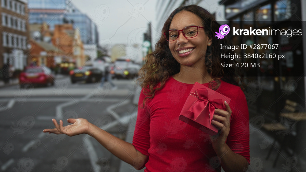 Woman smiling, holding red gift box with bow, wearing glasses and gesturing with open left hand on a busy city street near a cafe storefront; surprise joy. - Kraken Images