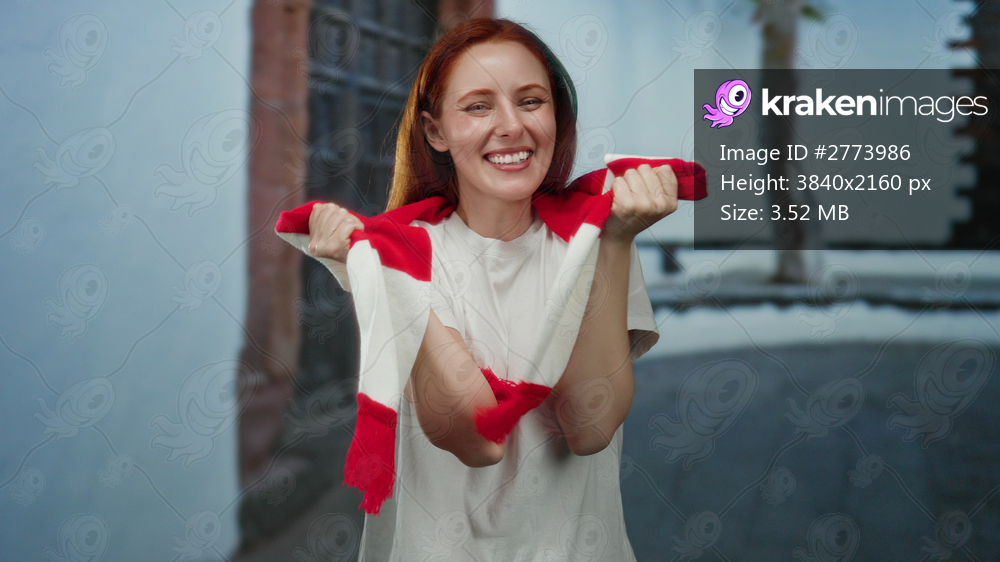 Woman smiling holding red scarf on city street, showing happiness and cheer, young adult redhead wearing casual white shirt in outdoor urban environment. - Kraken Images