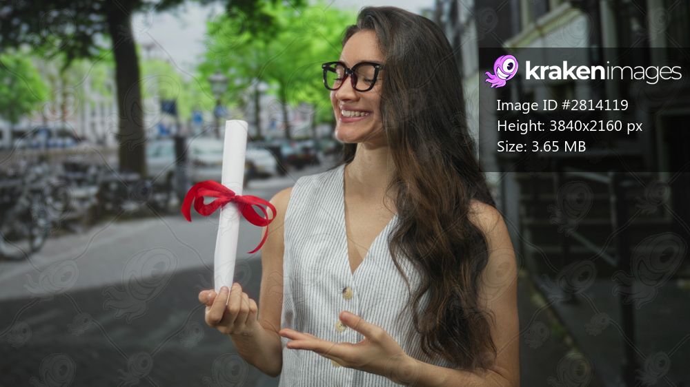 Woman smiling and holding rolled diploma while pointing to certificate on street; achievement graduation pride.