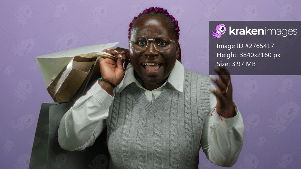 Woman smiling holding shopping bags over isolated purple background with joyful expression and surprise.