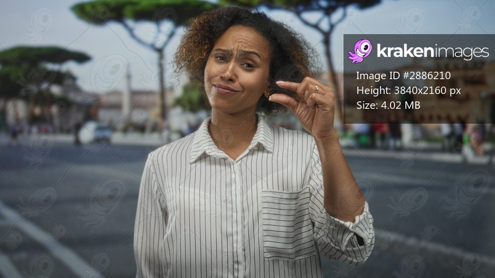 Woman smiling, holding small object between fingers and showing hand in striped shirt on street; optimism travel discovery.