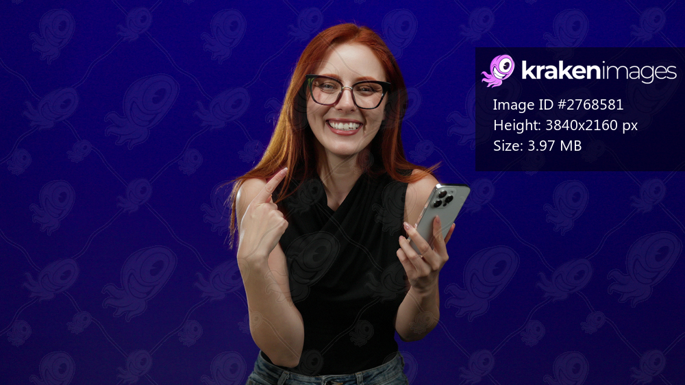 Woman smiling holding smartphone against blue background showing happiness confidence modern lifestyle.