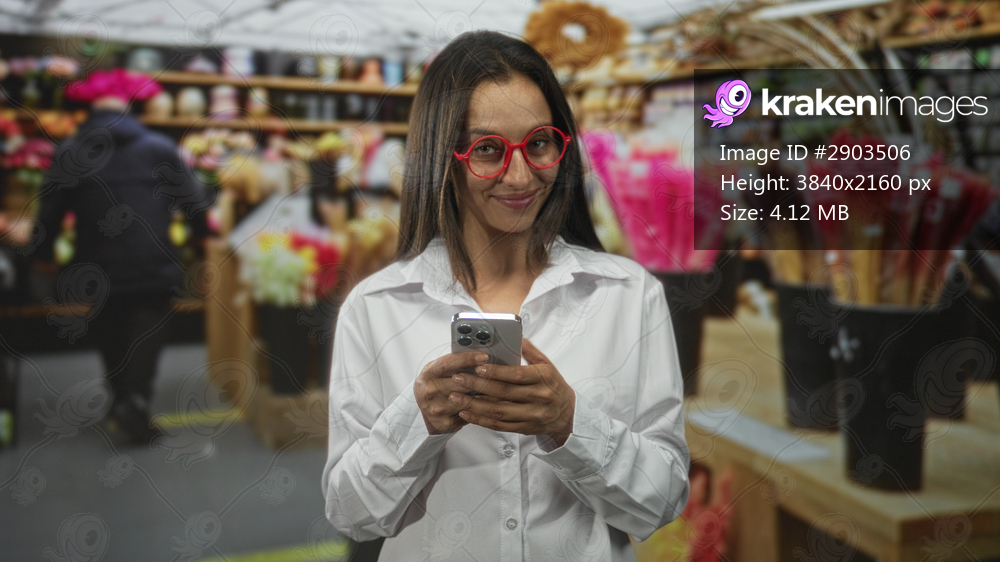 Woman smiling, holding smartphone with both hands amid colorful flower shop displays in building; simple joy.