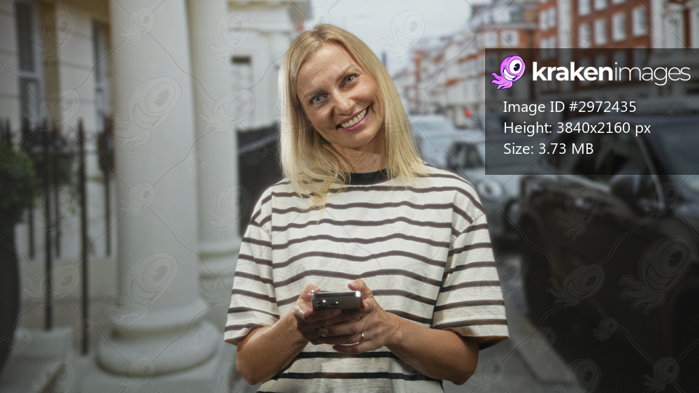 Woman smiling and holding smartphone with both hands, wearing a striped shirt on a city street by parked cars and white columns; cheerful.