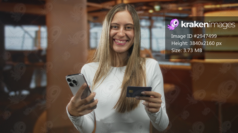 Woman smiling holding smartphone and creditcard in airport terminal with both hands; happiness convenience travel.