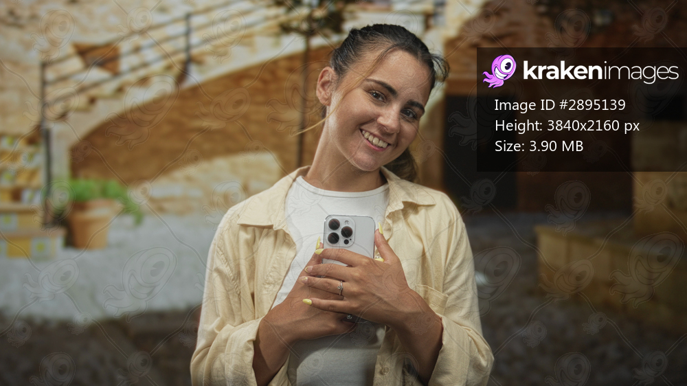 Woman smiling and holding smartphone with hands over chest on an old town street, yellow nails and rings visible; serenity connection.