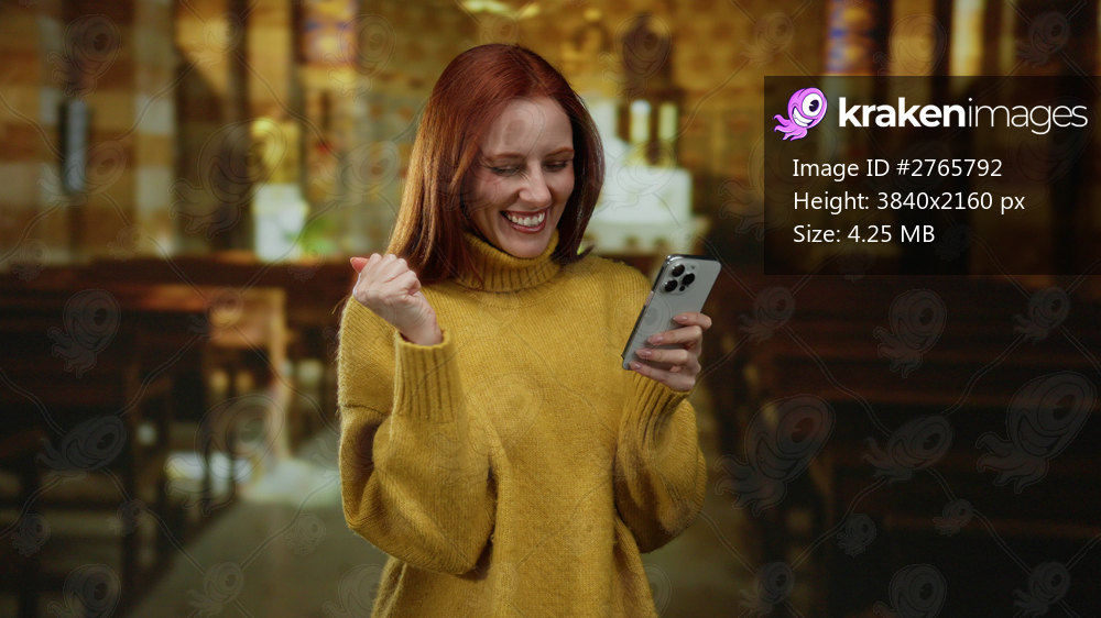 Woman smiling holding smartphone inside a serene church setting, wearing a cozy sweater, capturing the mood of joy and connection amidst peaceful surroundings. - Kraken Images