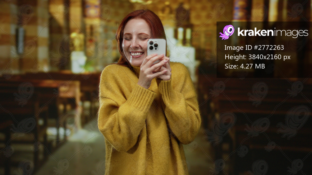 Woman smiling holding smartphone inside a serene church setting, wearing a cozy sweater, capturing the mood of joy and connection amidst peaceful surroundings. - Kraken Images