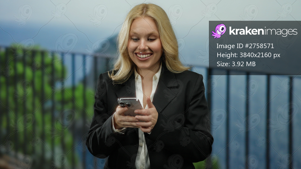 Woman smiling and holding smartphone on beachside promenade with ocean view, sunny day, blonde hair, and business attire.