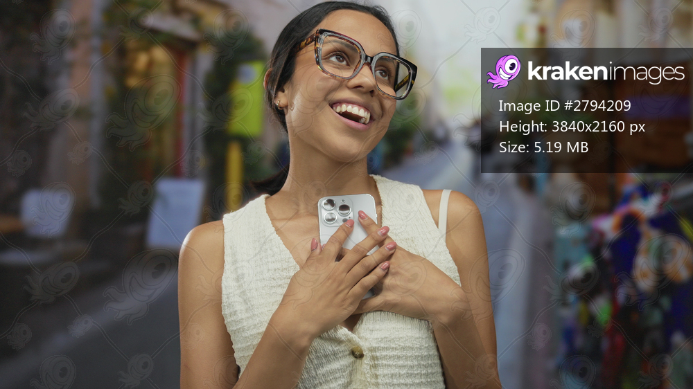 Woman smiling holding smartphone on vibrant outdoor street with big glasses and summer clothing, exuding joy and happiness in a lively urban atmosphere. - Kraken Images